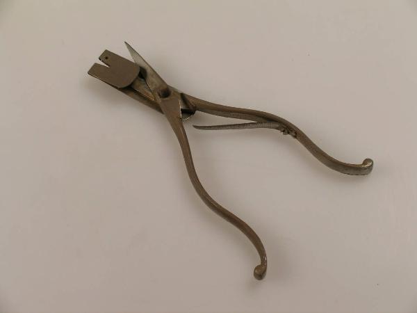 Sorta di forbice, la cui apertura e chiusura è regolata da una leva, fissata con una vite alla parte interna di uno dei bracci dell'impugnatura e incidente sull'altro. Alla pressione sull'impugnatura, sagomata per una maggior facilità di presa, le due lame di chiudono, e si riaprono spontaneamente al termine della pressione. La vite posta all'incrocio dei bracci fissa la forbice a una placchetta metallica che si ripiega su se stessa e presenta al centro una scanalatura, in modo che la punta della forbice rimanga scoperta solo in corrispondenza della scanalatura.