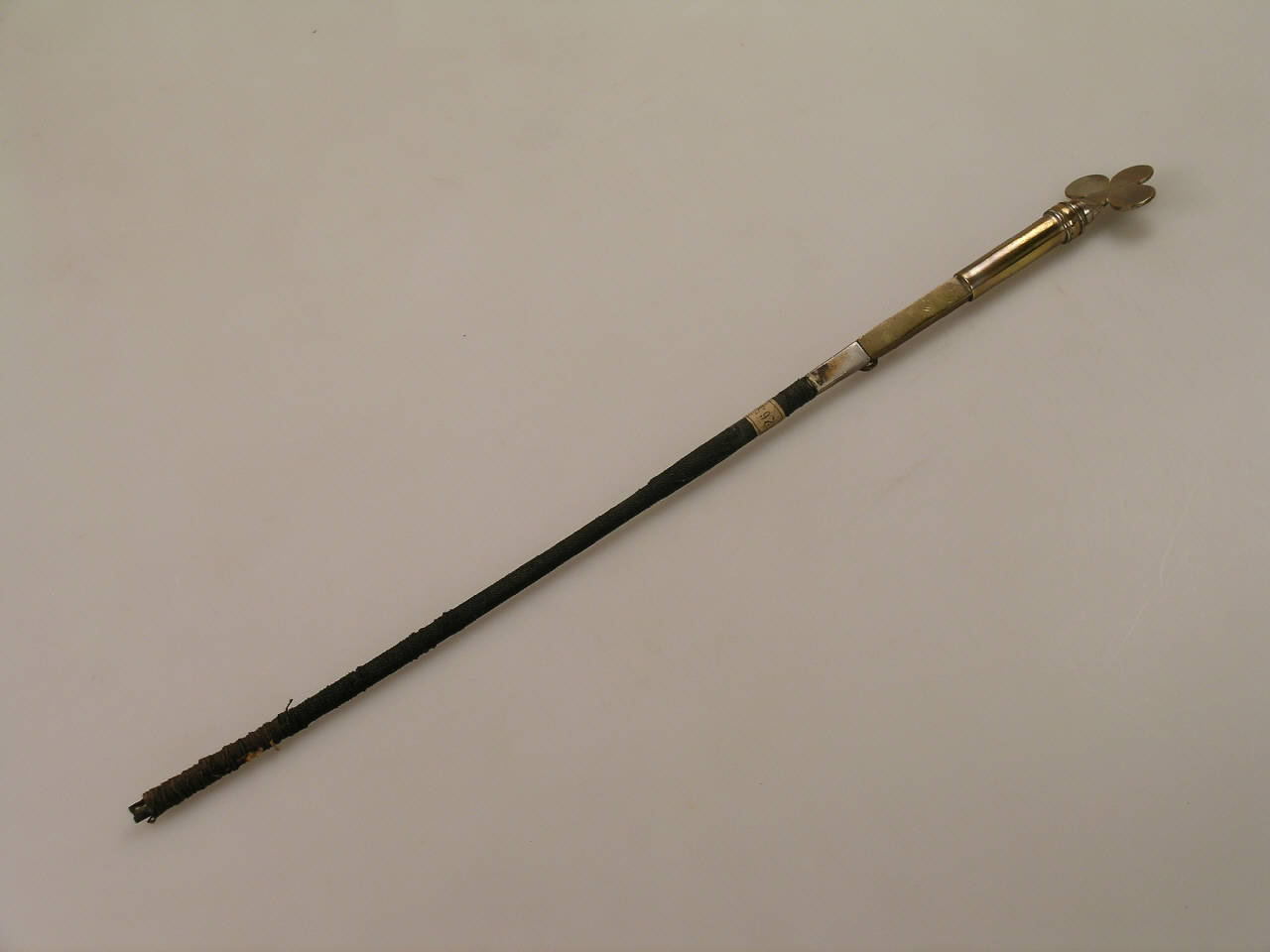 Una stecca di balena, cava all'interno, è ricoperta all'esterno con filo di seta fermato alle due estremità da bordi d'argento, uno dei quali mancante che doveva terminare in una sorta di piccola pinza costituita da due alette (all'interno concave e dentate, e convesse all'esterno) in grado di muoversi lungo un asse, aprendosi e chiudendosi come un bacello. L'apertura e la chiusura di queste alette poteva essere regolata manovrando un manubrio posto all'altra estremità. Esso è collegato, tramite una barretta metallica terminante in un piccolo gancio, a un filo che, passando all'interno della cavità della stecca di balena, si congiunge con le due alette passando sotto due anellini d'argento fissati all'interno di ciascuna delle ali. Il manubrio è esternamente fissato alla stecca di balena tramite una chiusura costituita da un anellino e un gancetto.
