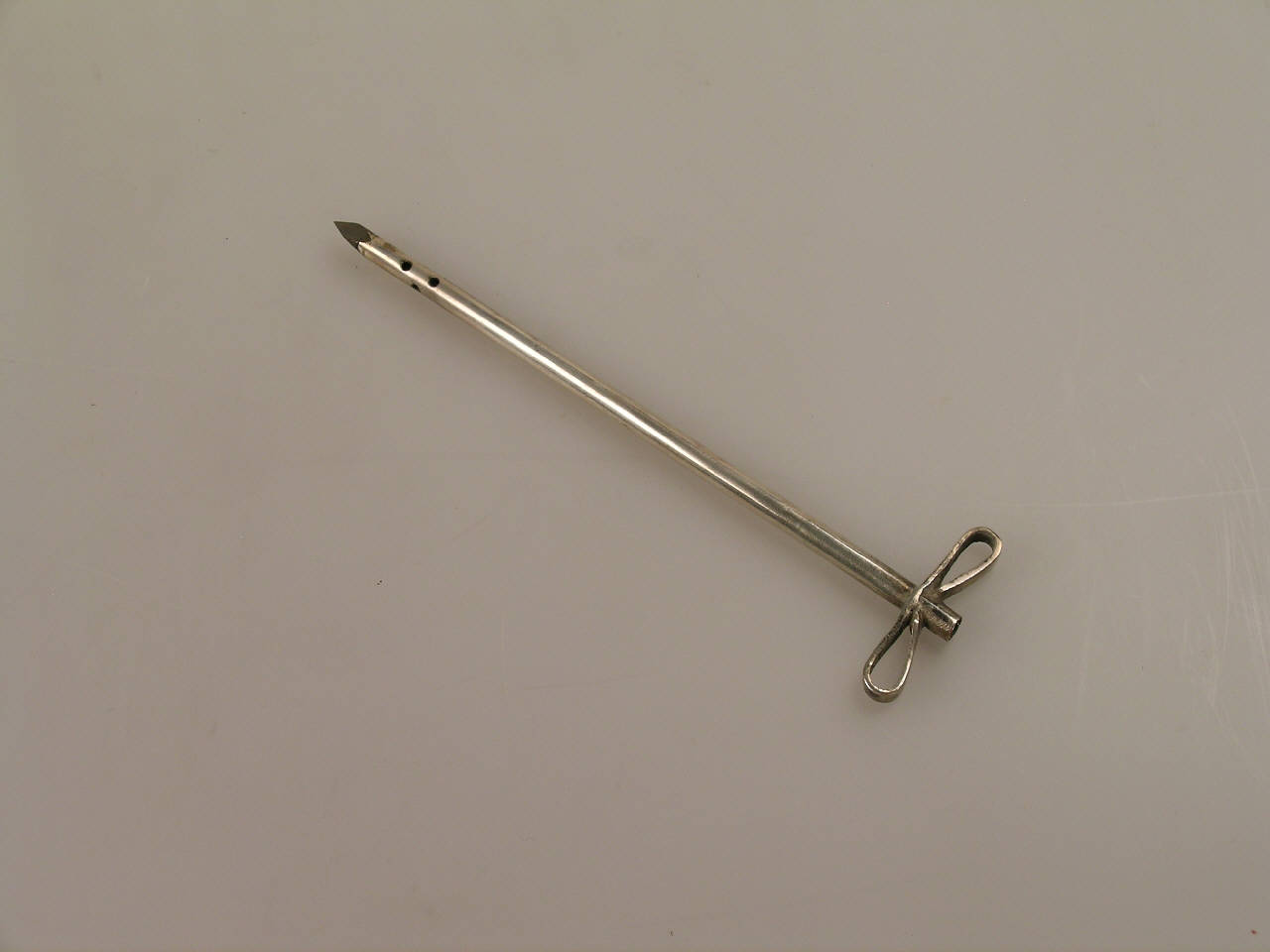 Ago in argento con punta d'acciaio, dotato di una impugnatura costituita da due occhielli laterali e cavo all'interno. Sotto la punta sono praticati alcuni piccoli fori. Effettuata l'incisione li strumento poteva essere impiegato anche per il drenaggio.