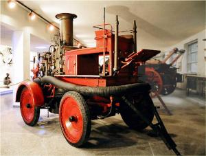 Vista anteriore della pompa a vapore con il posto del conducente a cassetta. Originariamente montata su carro ippotrainato. Pressione di lavoro 8,75 Atm. Superficie della caldaia "NEGRI" 2 mq. Portata della pompa 600 l/m, 1 bocca di aspirazione da 125 mm. e 4 bocche prementi da 70 mm.