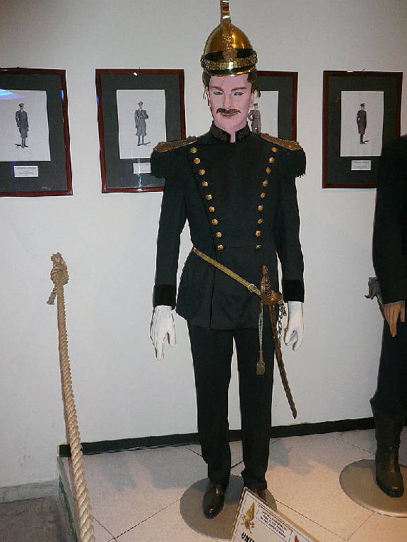 Uniforme da parata in panno blu per Ufficiali dei Civici Pompieri del Comune di Milano, completa di elmo, controspalline, sciabola e stivali in cuoio. Periodo d'impiego 1880-1937.