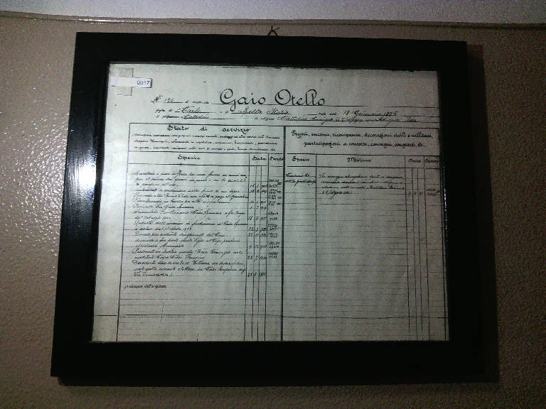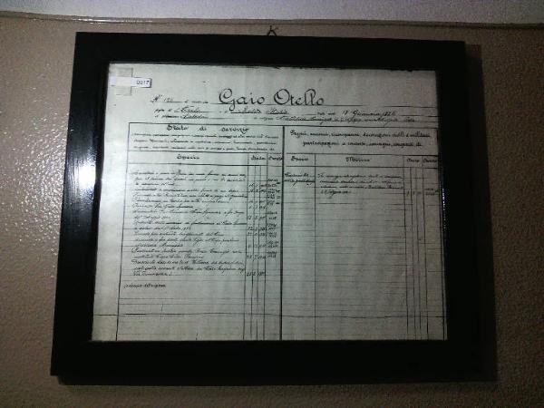 Quadro contente fotocopia dell'originale dello Stato di Servizio di Otello Gaio.