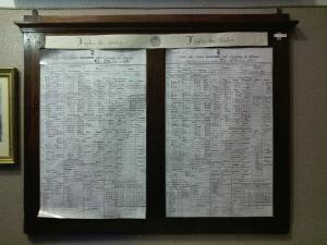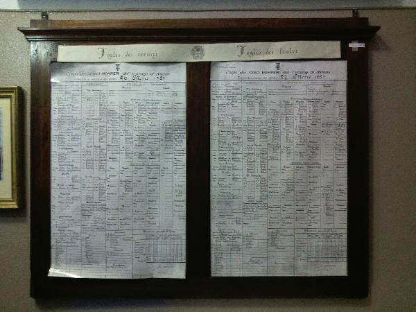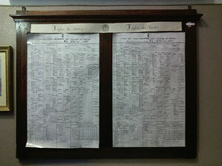Bacheca in legno contenente fogli di servizio del giorno 26/27 ottobre 1925 per servizio ai teatri di Milano
