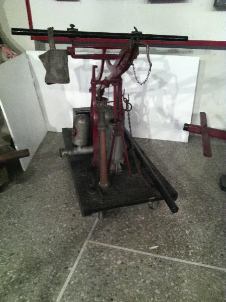 Pompa a mano per tubazioni del diametro 70. E' presente tubazione antincendio e lancia in rame diametro 70 e secchiello in juta. Pompa barellabile, ossia con possibilità di trasporto a mano tipo barella. Con manici ripieghevoli.