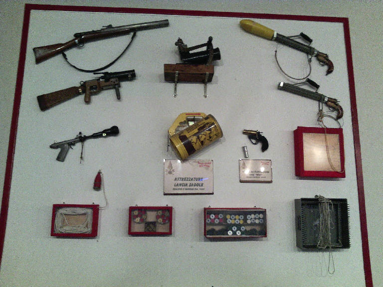Teca con diversi oggetti con Attrezzature lancia sagole.