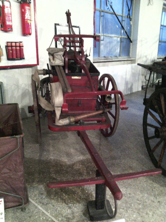 Pompa a mano bicilindrica a campana montata su carro. Periodo d'impiego 1880 - 1890.