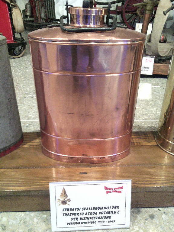 Serbatoio spalleggiabili per trasporto acqua a fini antincendio e per schiumogeno. Periodo impiego 1930/1945. Materiale Rame.