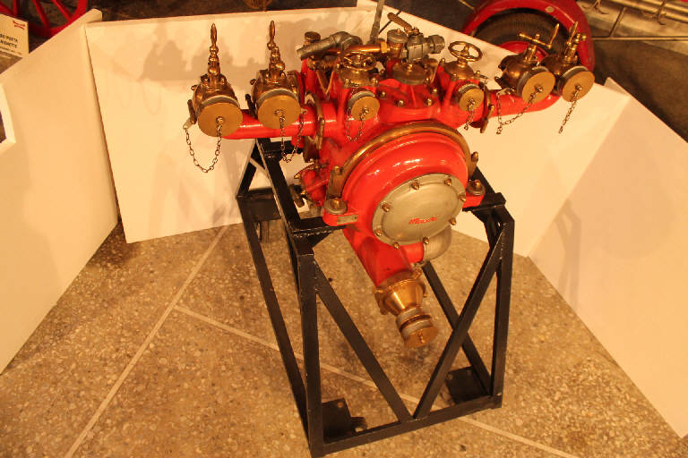 Pompa "Macchi" con presa di forza. Bocca di aspirazione acqua diametro 80 mm. N° 4 mandate di acqua diametro 70 mm e n°2 diametro 45 mm. Tutte in bronzo