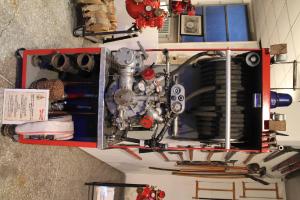 Pompa centrifuga a bassa e alta pressione "Rosenbauer" installata su autobotte pompa (ABT) Marca: OM150. Corpo in lega leggera, 4 tiranti in serie (una per bassa pressione, 3 per alta pressione). La bocca di aspirazione è di 100 mm. Due bocche di mandata da 70 mm (bassa pressione). Due bocche di mandata da 38 mm (alta pressione). Portate in funzione separata: Bassa pressione (1700 L/1' con prevalenza 80 m. Alta pressione (350 L/1' con prevalenza 400 m). In funzione combinata: Bassa pressione (1300L/1' con prevalenza di 80 metri) Alta pressione (200 L/1' con prevalenza a 320 m). REGIME DI ROTAZIONE MASSIMO DELLA POMPA 5300 giri al 1' primo.
