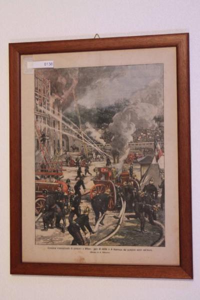 Quadro con foglio de "La Domenica del Corriere" soggetto: Concorso internazionale di pompieri a Milano Arena Civica