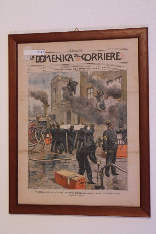 Quadro con foglio de "La Domenica del Corriere" soggetto: Saggio pompieristico all'Arena di Milano data 24-09-1899