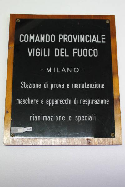 Targa della stazione di prova e manutenzione degli apparecchi di respirazione del Comando provinciale Vigili del Fuoco di Milano. (Nicchia con maschere e apparecchi di respirazione e speciali)