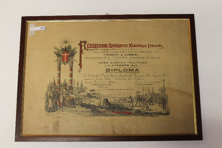 Diploma con medaglia di bronzo e argento assegnate al Corpo Pompieri Civici di Milano dalla federezione ginnastica italiana il 9 ottobre 1910