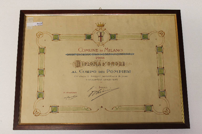 Quadro con diploma di onore per il maggior numero di premi nelle gare sportive tra i corpi municipali 1908