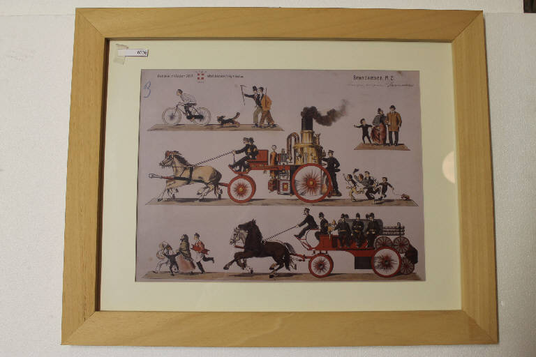 Quadro con stampa rappresentante pompa a vapore e carrozza antincendio ippotrainata