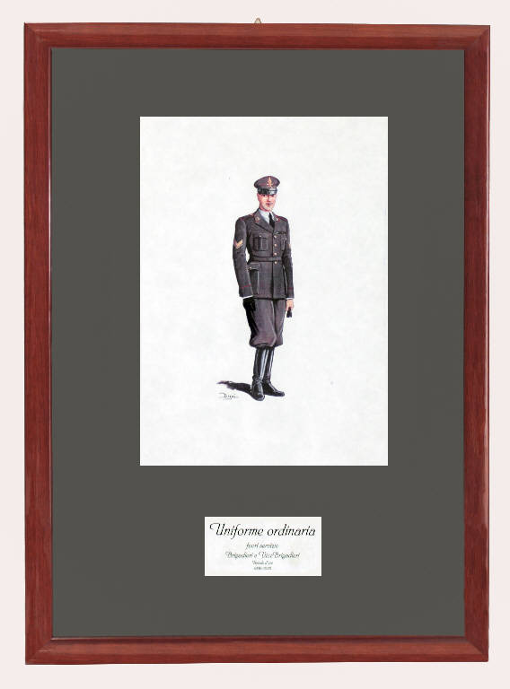 Quadro contenente bozzetto realizzato a tempera di uniforme ordinaria per brigadieri e vice brigadieri fuori servizio. Autore Delgai periodo uso dal 1939 al 1948