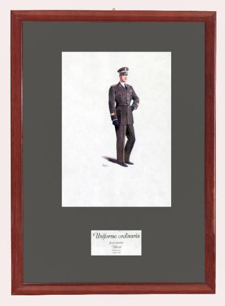 Quadro contenente bozzetto realizzato a tempera raffigurante uniforme ordinaria per Ufficiali fuori servizio Autore Delgai periodo uso dal 1939 al 1948