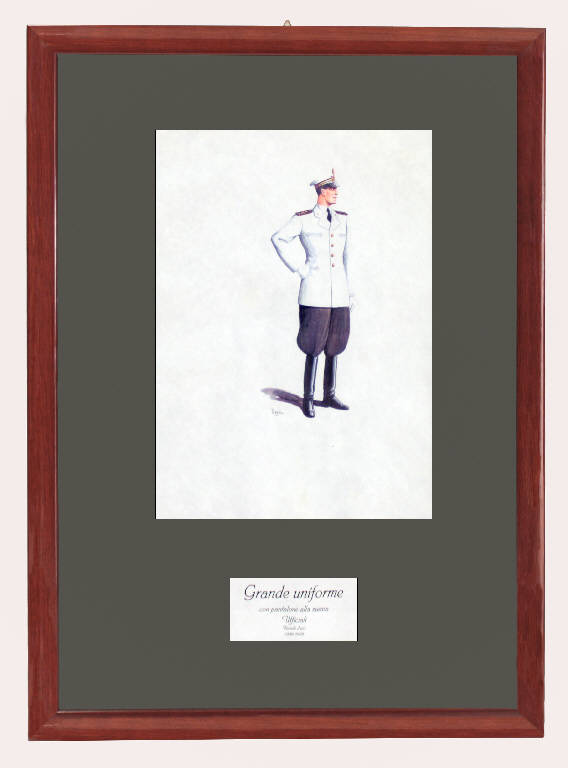 Quadro contenente bozzetto realizzato a tempera raffigurante uniforme ordinaria per ufficiali fuori servizio con pantalone alla zuava fuori servizio Autore Delgai perido uso dal 1939 al 1948