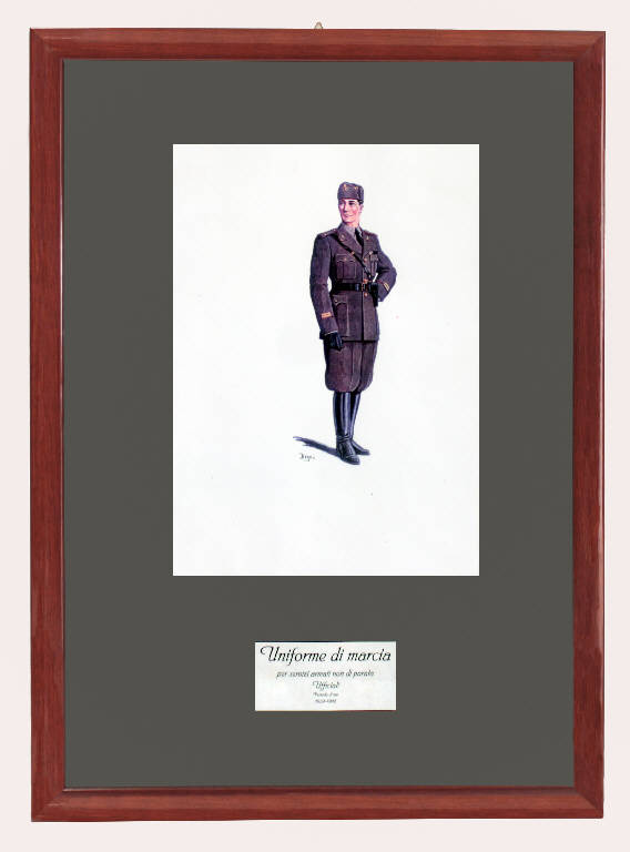 Quadro contenente bozzetto realizzato a temoera raffigurante uniforme di marcia per Ufficiali per servizi armati non di parata Autore Delgai periodo uso dal 1939 al 1948
