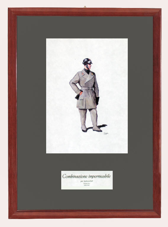 Quadro contenente bozzetto realizzato a tempera raffigurante combinazione impermeabile per motociclisti Autore Delgai periodo uso dal 1939 al 1948