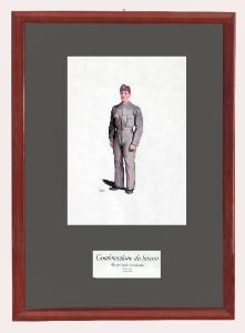 Quadro contenente bozzetto realizzato a tempera raffigurante combinazione da lavoro per personale specializzato Autore Delgai periodo uso dal 1939 al 1948