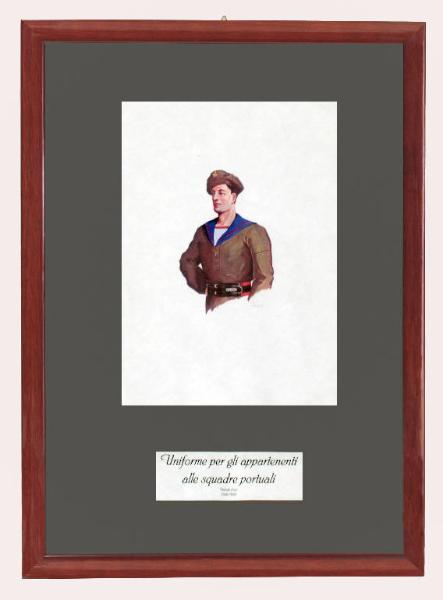 Quadro contenente bozzetto realizzato a tempera raffigurante uniforme per gli appartenenti alle squadre portuali Autore Delgai perido uso dal 1939 al 1948