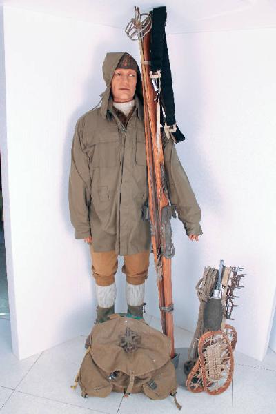 Uniforme delle squadre di montagna, periodo di impiego dal 1941 al 1956 completa di : Zaino, sci con pelli di foca, bastoncini, borraccia, racchette da neve, rampini da ghiaccio e fune di salvataggio.