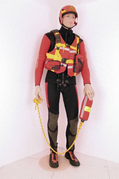 Tenuta da intervento per soccorritore fluviale periodo di impiego dal 1988, completa di: casco, giubbotto di aiuto al galleggiamento e corda da lancio.