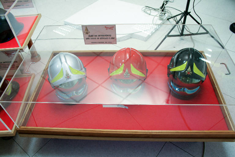 Teca contenente elmi da intervento SICOR VFR2000 in Kevlar e abs periodo uso dal 2003\nColore nero per i vigili, rosso per i capisquadra e capireparto, grigio per i funzionari.