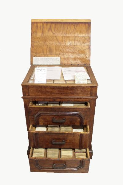 Schedario in legno con 3 cassetti contenente la toponomastica milanese