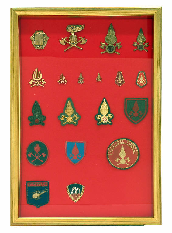 Quadro a teca contenente alcuni fregi, mostrine e distintivi dei Civici Pompieri di Milano, del 52° Corpo di Milano e del Corpo Nazionale Vigili del Fuoco