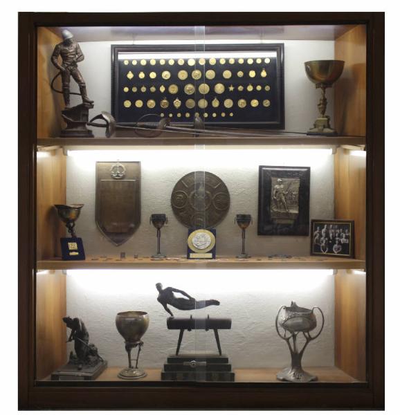 Vetrina contenente: Ripiano A (superiore) statuetta in bronzo raffigurante Pompiere con manichetta antincendio, 3 spade , coppa per la vittoria Campionati Dei Dipendenti Comunali nel 1927 e quadro teca contenente varie medaglie d'oro ottenute durante i vari concorsi del Corpo Sportivo Pompieri di Milano. Ripiano B centrale: Targa in bronzo commemorativa gara di nuoto delle Decurie negli anni 1930-31-32-33-34 (a parete sx) , targa in bronzo circolare rappresentante gli stemmi del Corpo Nazionale Dei Vigili Del Fuoco è il motto dei Pompieri di Milano " In Adversis Securi" (a parete centrale), quadro in legno con targa in peltro della Giornata Del Pompiere svoltasi a Milano il 20-09-1925 (a parete dx) ,coppe e medaglie vinte dal gruppo sportivo VV.F. C. Galimberti (sul piano). Ripiano C (inferiore) : coppe e trofei vinti dal gruppo sportivo 52° Corpo VV.F. Milano nel 1958.