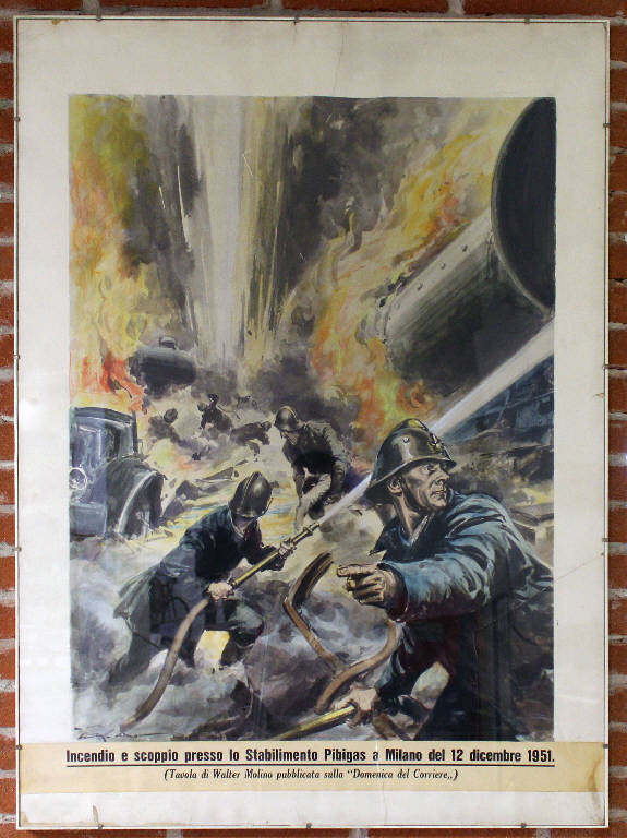 Quadro con tavola pubblicata sul giornale Domenica Del Corriere raffigurante incendio e scoppio presso lo stabilimento Pibigas a Milano del 12-12-1951