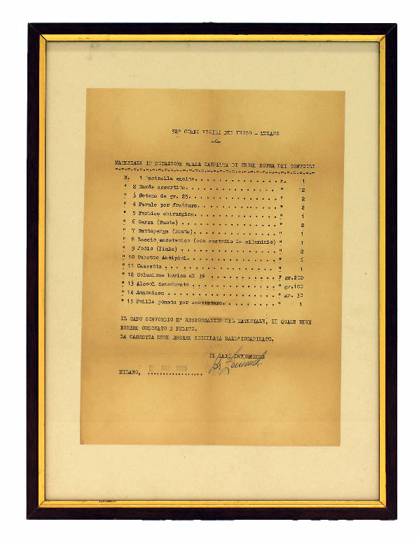 Quadro contenente foglio dattiloscritto indicante materiale in dotazione nella cassetta di Croce Rossa dei Convogli - Agosto 1959