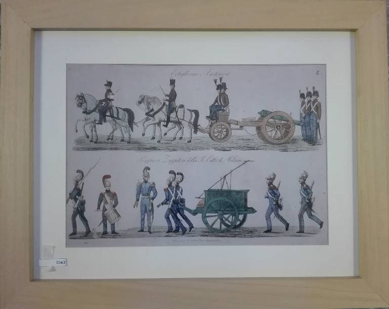 Quadro con stampa rappresentante con artiglieria austriaca e zappatori pompieri della regia città di Milano