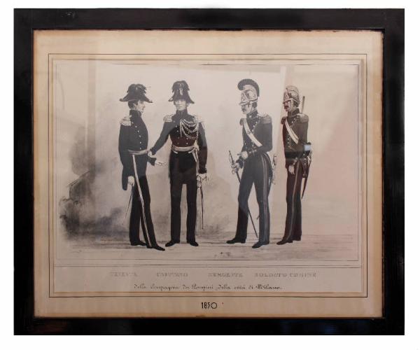 Quadro bozzetti divise Tenente-Capitano-Sergente- Soldato Comune Campagna Zappatori Pompieri Città di Milano 1850