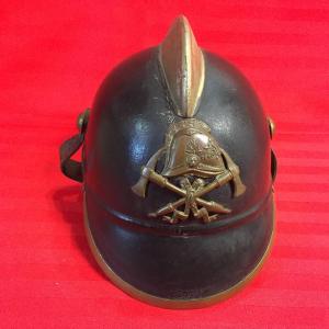 Elmo in cuoio verniciato, con stemma da ufficiale. Marocchino in cuoio (parte interna che serve ad adattare l'elmo al capo) e con lacci, visiera e paranuca in cuoio verniciato. Cresta, borchie e finiture visiera in ottone. Lo stemma raffigura due asce incrociate legate da un nastro ed un elmo da parata. Secondo il catalogo "Rosenbauer" (nei documenti) tale emblema veniva prodotto per gli ufficiali