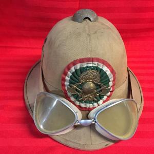 Elmo coloniale in dotazione al corpo dei Vigili di Bengasi (Libia), sughero rivestito di tessuto, stemma in ottone su coccarda Italia, taschino esterno, fori di aerazioni, fascia interna in cuoio,bottone in metallo in cima. Dotato di occhiali antisabbia in metallo, materiale plastico, gomma