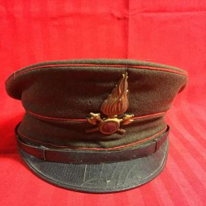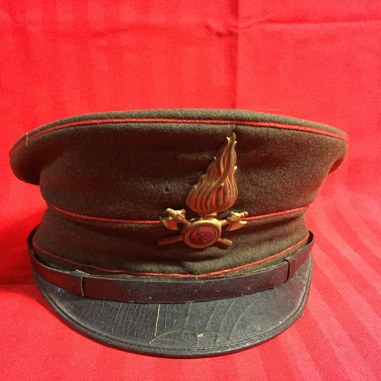 Berretto in panno da libera uscita con bordature in rosso, stemma in ottone dorato con "52" dei Vigili del Fuoco di Milano, visiera in cuoio nero, soggolo in cuoio nero con bottoncini in ottone dorato ai lati, fascia interna in cuoio, fodera in stoffa