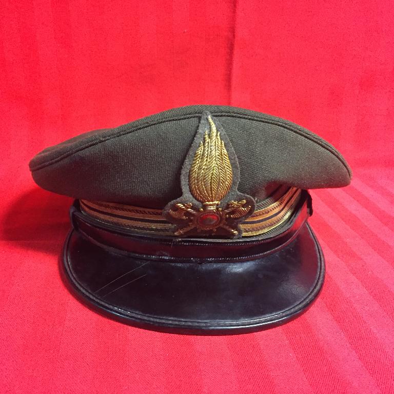 Berretto in sallia da libera uscita,con stemma ricamato in oro con croce, greca in passamaneria dorata da maresciallo, visiera e soggolo in cuoio nero lucido con bottoncini in ottone dorato ai lati, fascia interna in cuoio, fascia rigida in plastica, fodera in raso con marchio di fabbrica "S.Cardia,Roma".