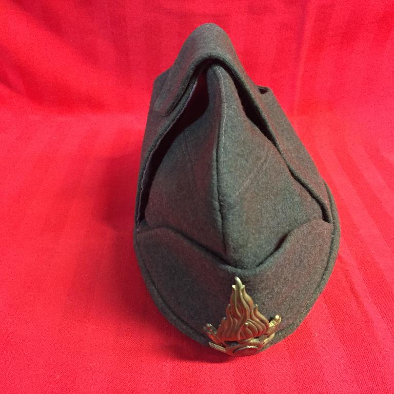 Bustina in panno, divisa invernale, con stemma in lamiera dorata e simbolo croce in smalto, copriorecchie e paranuca ripiegati in cima e fissati con automatici, fodera in stoffa