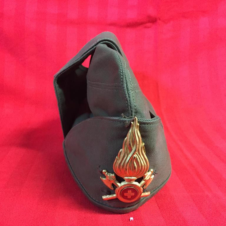 Bustina in tela, divisa estiva, con stemma in lamiera dorata e simbolo croce in smalto, copriorecchie e paranuca ripiegati in cima e fissati con automatici, fascia interna in cuoio, fodera in stoffa