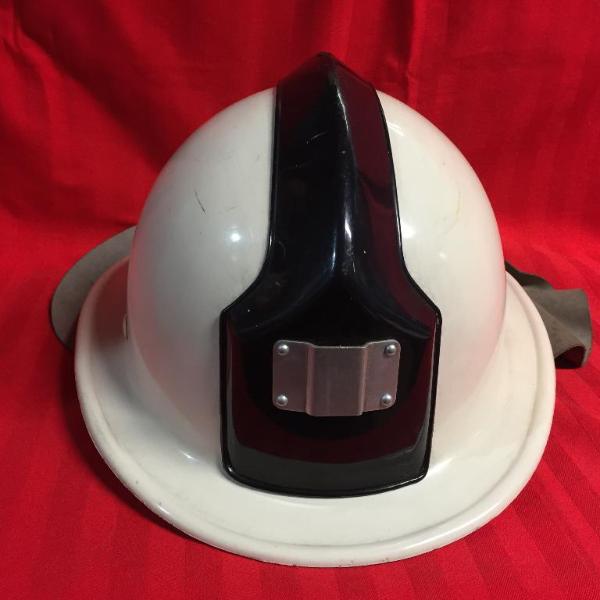 Elmo in materiale plastico bianco, con cresta in plastica nera applicata con viti, gancio in metallo per fissare stemma, copricollo in cuoio, sistema di adattamento al capo in cuoio, con bande in stretch, data 1982, scritta "DAG" in rosso sull'elmo. Data, simboli e codici stampati sul retro della visiera