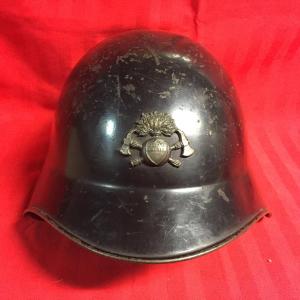 Elmo in ferro dipinto nero, modello tedesco, con stemma con scudo recante scritta "liberté et patrie), probabile cantone svizzero VAUD, fori aerazione, marocchino in cuoio con lacci, sottogola in cuoio, imbottitura interna in tela, all'interno una sigla "F6387"