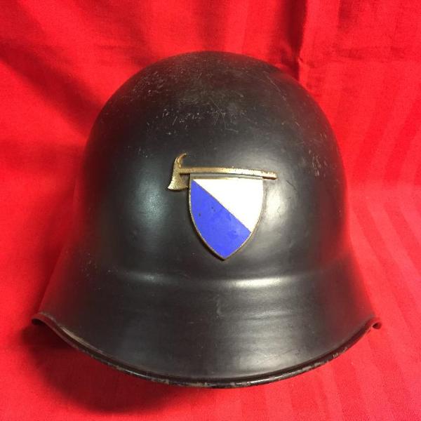Elmo in ferro dipinto nero, modello tedesco, con stemma con scudo in smalto bianco e celeste e ascia in ottone, probabile cantone svizzero Zurigo ("trinciato di argento e di azzurro"), fori aerazione, marocchino in cuoio con lacci, sottogola in cuoio.