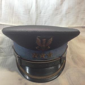 Berretto da divisa in tela blu, con visiera e soggolo in cuoio nero lucido, fregio con aquila ricamata in oro, tre stellette ricamate in oro su nastro azzurro, bordino dorato sulla visiera,bottoncini dorati con aquila ai bordi del soggolo, fascia interna in pelle e fodera in stoffa, rinforzo in plastica e sigla "06-87r" stampata all'interno