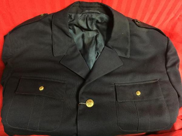 Giacca da divisa in tela blu, divisa invernale, quattro tasche, taglia 58, bottoni dorati con stemma con stellina entro scudo e asce incrociate (come bottoni giacca scheda n.179).Divisa nuova con etichetta ancora attaccata ai bottoni