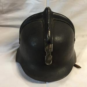 Elmo mod. tedesco in ferro dipinto nero, con rinforzo a stella applicato, in alluminio dipinto nero (manca lo stemma davanti), fori aerazione, marocchino in pelle con lacci, imbottitura interna completa (di tutto l'elmetto) in pelle imbottita, sottogola in cuoio, gancio posteriore