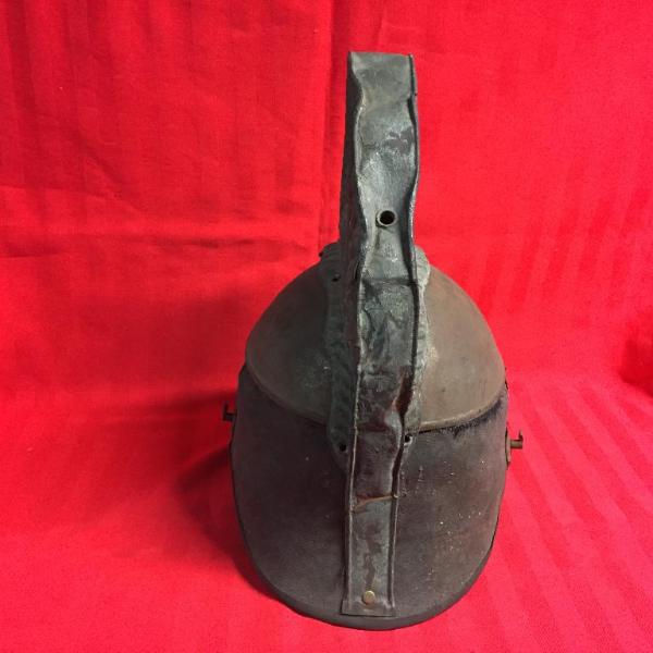 Elmo da parata di probabile provenienza francese, con calotta superiore in metallo e parte inferiore in cuoio, con evidenti segni di crini tagliati, cresta in ottone decorata a sbalzo con fori per pennacchi e simbolo granata, stemma in ottone con scudo e asce incrociate (non sembra d'epoca), bordature in ottone, ganci per soggolo (mancante), marocchino in cuoio con lacci, rinforzo della calotta in cuoio in rete metallica