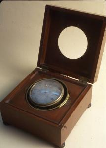 Cassa in legno liscia, non pertinente, con sospensione cardanica e cassa dell'orologio in ottone.\nQuadrante con indicazione delle ore in caratteri romani. Quadrante dei secondi nella parte bassa con indicazione in cifre arabe di dieci in dieci. Quadrante nella parte alta per l'indicazione della riserva di carica.\nMovimento a otto giorni di carica a platina intera con colonnini cilindrici. Conoide a catena, scappamento a detente. Carica a chiavetta posteriore.